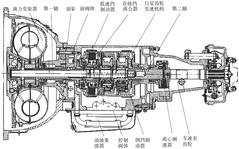 (2)执行机构:执行机构主要由离合器、制动器油缸等组成。其功用是在控制油压的作用下实现离合器的接合和分离、制动器的制动和松开动作,以便得到相应的挡位。