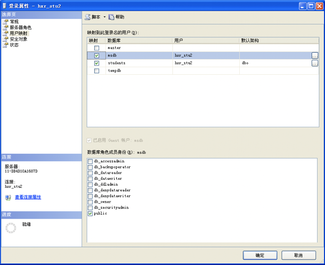 (2)单击“登录属性”对话框左侧的“用户映射”选项,可以为当前用户添加一个连接数据库“msdb”
