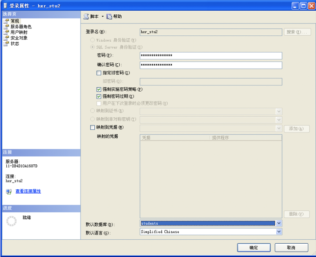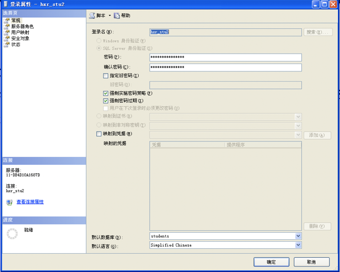 (2)展开“安全性”文件夹和“登录名”文件夹以列出当前的登录。右击一个登录,然后从快捷菜单中选择“属性”以查看此登录的属性。这样会打开“登录属性”对话框。