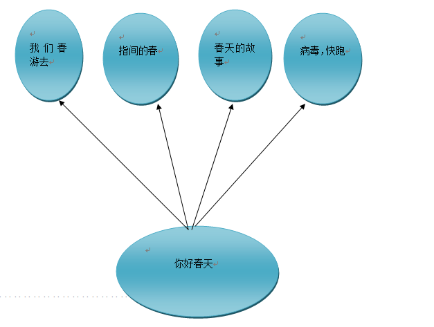 我们组将主题墙设计成扇形结构,以“春天来了”为大主题,并根据小班的年龄特点和心理发展特征,开展了多个小主题有“我眼中的春天”、“小蝌蚪游呀游”、“种子宝宝成长记”、“花园里有什么”和“春游去了”。我们在创设时应多老驴到幼儿的意愿,不能只凭我们教师的主观想法去布置。