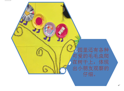 整体美感:我们希望给幼儿展示的主题墙是经过设计的,整体构图,立体感和平面感结合,凸显出画面感,给幼儿一种身临其境之感,给幼儿美的艺术体验。我们还很注重作品的展示,如用小幼苗象征孩子的茁壮成长,在幼苗上张贴照片,在小鸡和小鸭的蛋壳上展示幼儿作品。