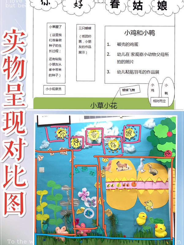 我们进行的是《春天来了》主题墙创设,而重点是里面的《小鸡和小鸭》这一小主题。大主题主要是让幼儿感知春天,学会用自己的方式表达表现春天,培养幼儿爱护花草、爱护小动物的感情。三个主题从植物到动物。贯穿《小鸡和小鸭》这一小主体的线索就是小鸡小鸭的出生和成长。