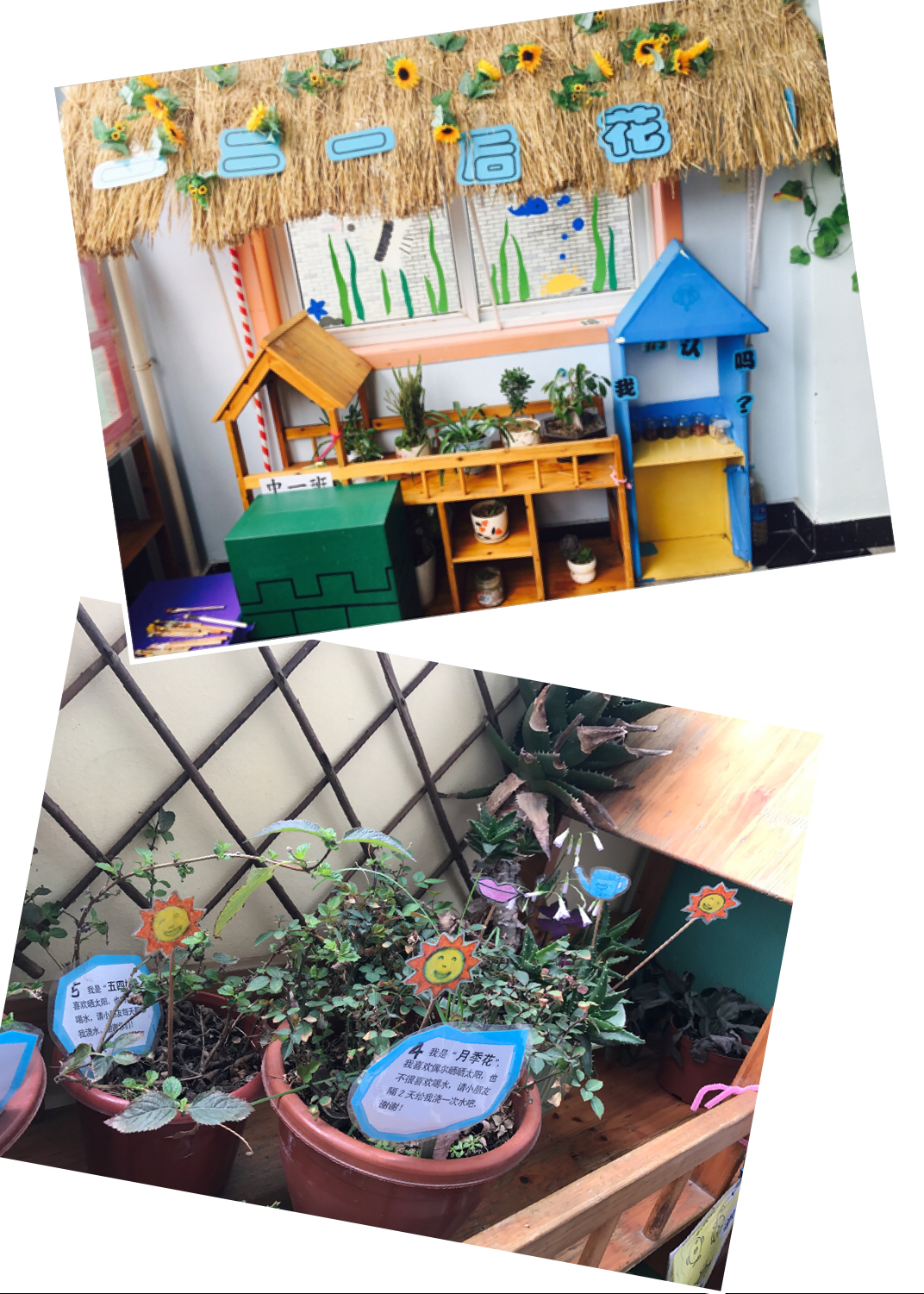 在楼梯的拐角处,有培养孩子爱心的动、植物角,植物角特别丰富,有各种花卉,孩子种植的农作物。孩子可以通过每天观察植物的生长变化,然后把观察结果记录到本子上。通过让幼儿种植、观察、管理等培养了幼儿积极学习的态度和主动探索的精神。
