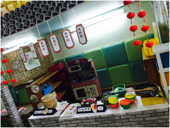 教室里的“餐厅”也十分具有韵味,餐厅是以古代人的生活风格进行装修的,这使幼儿感受和体验到传统文化,同时还有老板、服务员、客人等角色,食材有彩泥、纸质材料等,食物的制作也由幼儿自己创作,这不仅活跃了幼儿的思维,也使小肌肉群有一定的发展;