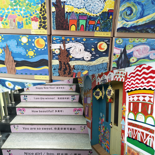 首先引入眼帘的就是各种各样丰富多彩的作品,这些作品有的是老师做的,有的是幼儿做的,有的是老师与幼儿或家长和幼儿同工完成的。这些作品不仅被贴在了柱子上,还贴在了台阶上。充分体现了幼儿的自主性和创造力,让人感受到这个幼儿充满了爱。