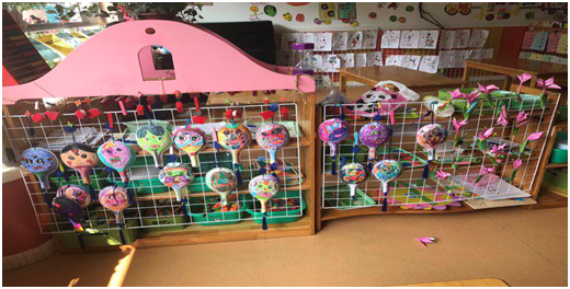 艺吧(美工区)材料的投放主要为半成品,环保材料低结构的装饰材料为主同时要与主题相结合,投放与主题相关的材料。美工区和小超市很好的做到了区域的联系,幼儿在美工区制作的手工(清明节主题下的清明果)可以放到超市进行买卖,体现了幼儿的参与性。