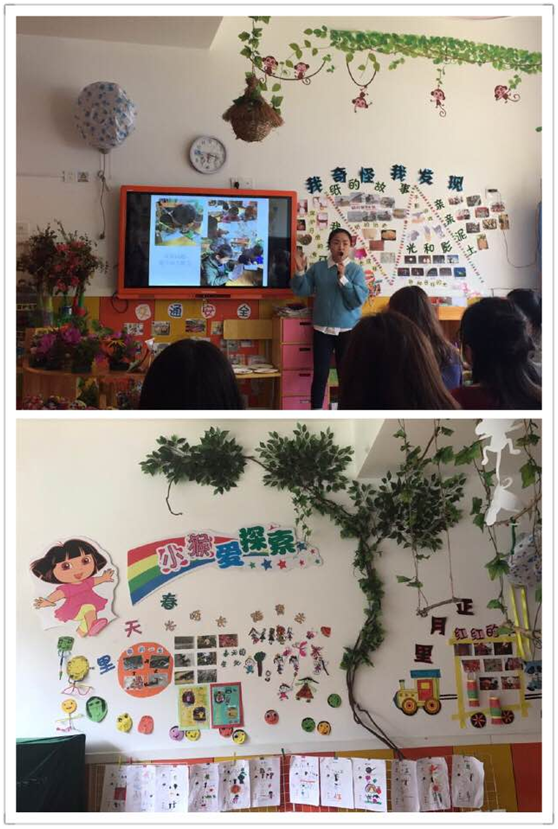 中二班的老师介绍他们班由域智慧屋(科学),书吧(语言),艺吧(艺术),小舞台(艺术),超市(社会)五个区域组成。结合主题教师在环境的布置上加入了很多小鬼的元素并指出在环境创设时,主题要适合本阶段的孩子,在大主题上应注重整体性,色调和风格统一,同时各区域要相对独立,主题要明确让幼儿知道自己在这个区域要做什么。