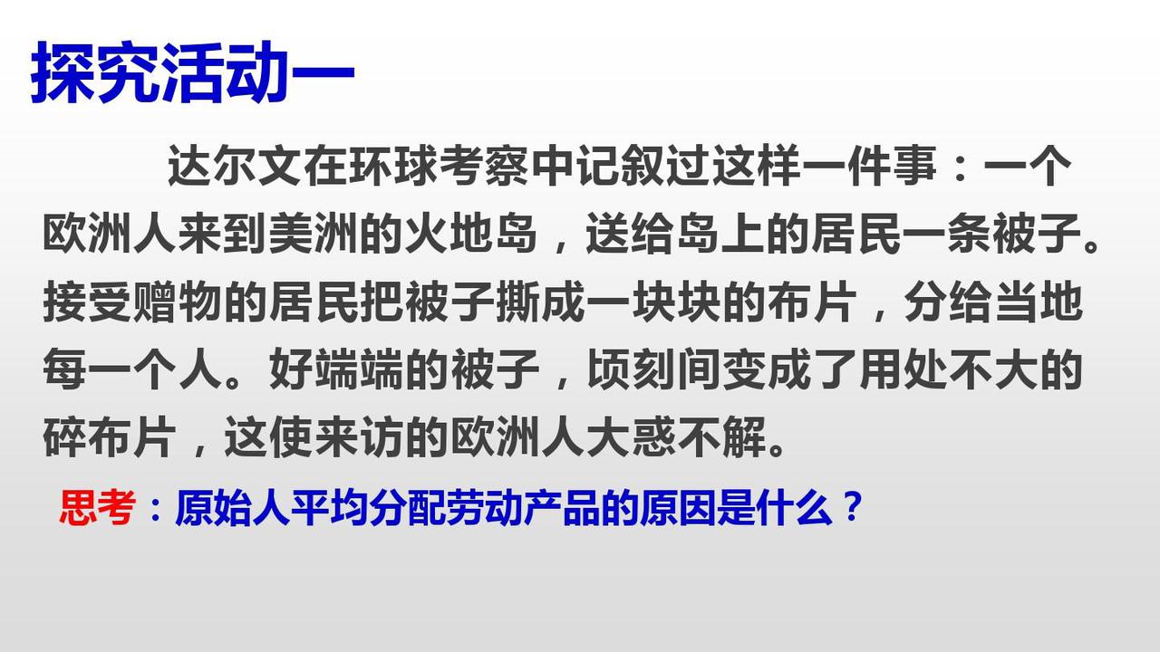 提示 查阅相关资料略。在原始社会,生产力低下,人们必须共同劳动,共同占有生产资料,在生产中结成平等互助的关系,平均分配劳动产品,只有这样才能保证整个部落的人能够在残酷的自然环境下生存下来并发展下去。