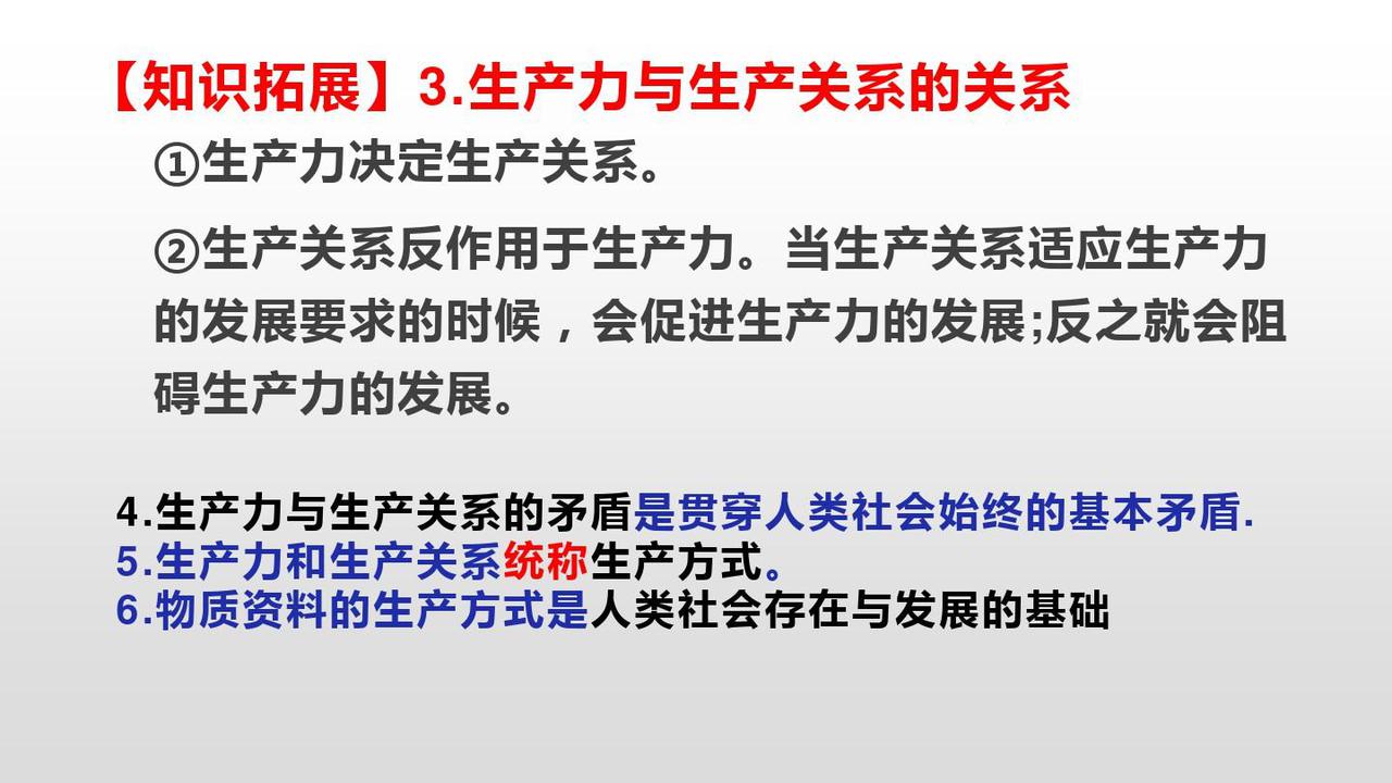 生产力决定生产关系,生产关系对生产力具有反作用。生产力与生产关系的相互作用构成了生产方式的矛盾运动,这一矛盾运动中,贯穿着生产关系一定要适合生产力状况的规律,这条规律是不以人的意志为转移的,是历史发展的根本规律。
