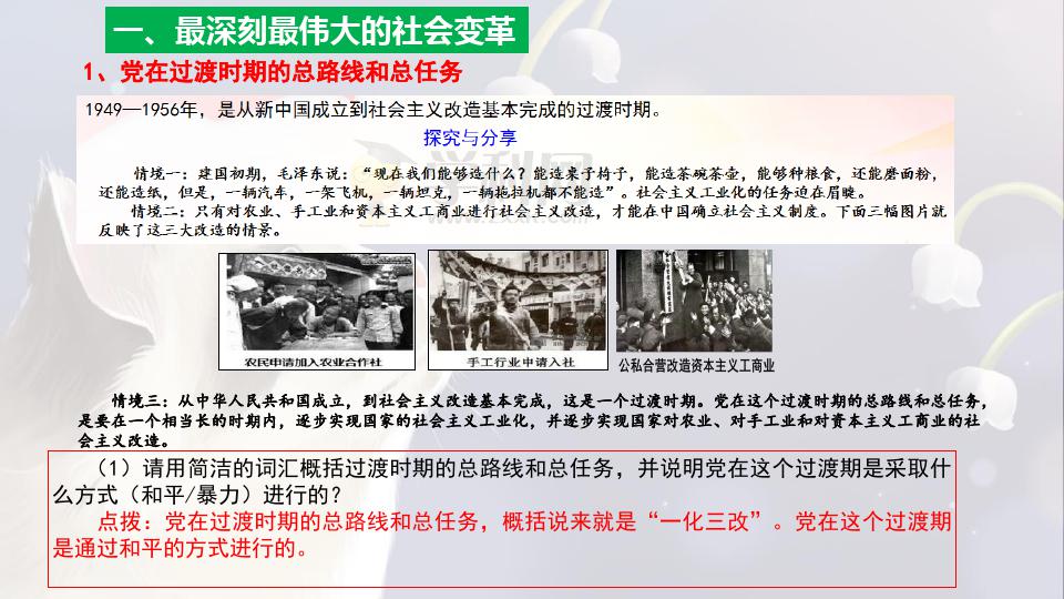 (2)在过渡时期总路线的指引下,中国共产党顺利实现了对生产资料私有制的_________________改造,在中国建立起__________________,完成了中华民族有史以来最深刻最伟大的社会变革。