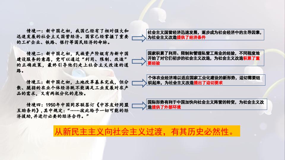 2.1956年,生产资料私有制的社会主义改造取得了决定性的胜利,标志着我国实现了从新民主主义到社会主义的转变,进入了社会主义社会。中国走上社会主义道路是历史发展的必然,是亿万中国人民在长期奋斗中作出的决定性选择。