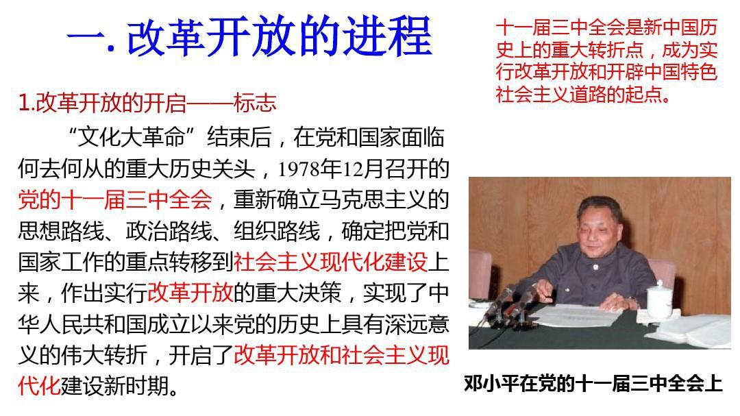 提示 1978年12月召开的党的十一届三中全会,重新确立了马克思主义的思想路线、政治路线和组织路线,确定把党和国家工作的重点转移到社会主义现代化建设上来,作出实行改革开放的重大决策,实现了中华人民共和国成立以来党的历史上具有深远意义的伟大转折,开启了改革开放和社会主义现代化建设新时期。
