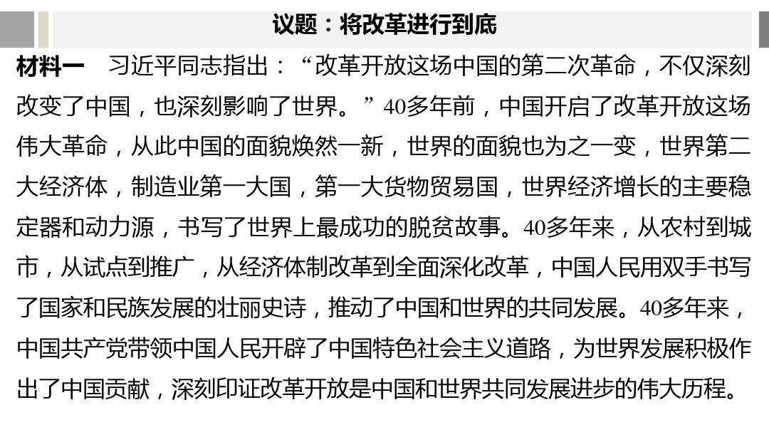 2.____________是决定当代中国命运的关键一招,也是决定实现“两个一百年”奋斗目标、实现中华民族伟大复兴的关键一招。对外开放是中国的____________。改革开放只有进行时,没有完成时。