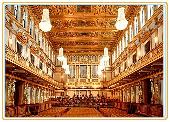 维也纳金色大厅是维也纳最古老、最现代化的音乐厅。是每年举行“维也纳新年音乐会”的法定场所。是意大利文艺复兴式建筑。外墙黄红两色相间,屋顶上竖立着许多音乐女神雕像,古雅别致。