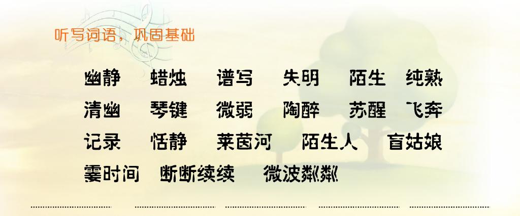 幽静——喧闹 陌生——熟悉 断断续续—连续不断 微弱——强烈 纯熟——生疏 微波粼粼—波涛汹涌 |