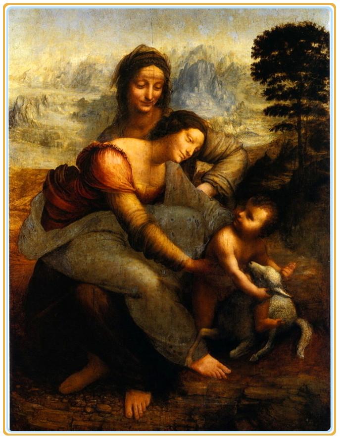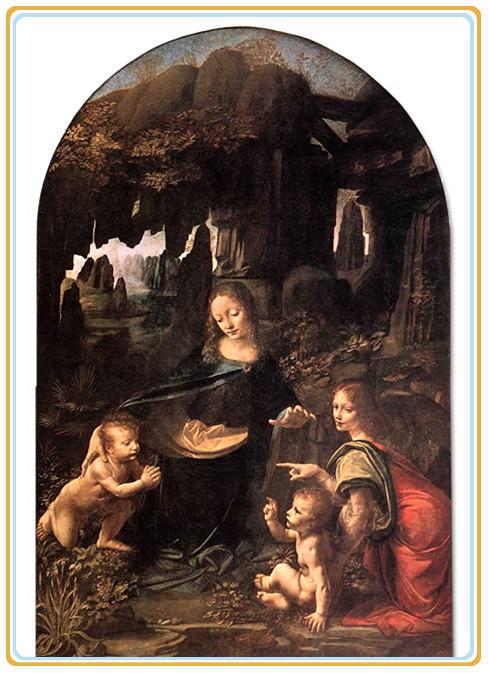 此画是应一宗教团体之请而为米兰的圣弗朗切斯科教堂的一间礼拜堂作的祭坛画。此画以圣母居图中央,她右手扶婴孩圣约翰,左手下坐婴孩耶稣,一天使在耶稣身后,构成三角形构图,并以手势彼此响应,背景则是一片幽深岩窟,花草点缀其间,洞窟通透露光。此画虽属传统题材,然表达手法和构图布局皆表明达芬奇的艺术水平之高深。人物,背景的微妙刻画烟雾状笔法的运用,科学地写实以及透视,缩形等技术法的采用,表明了他在处理逼真写实和艺术加工的辩证关系方面达到了新的水平。 |