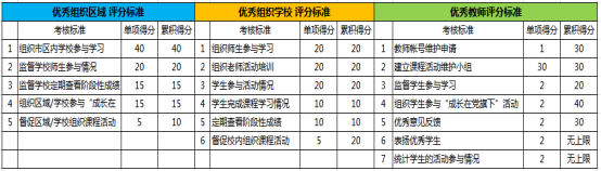 本次暑期慕课活动将评选出优秀区域组织奖5名,优秀学校组织奖5名,优秀辅导教师10名,评分细则如下: