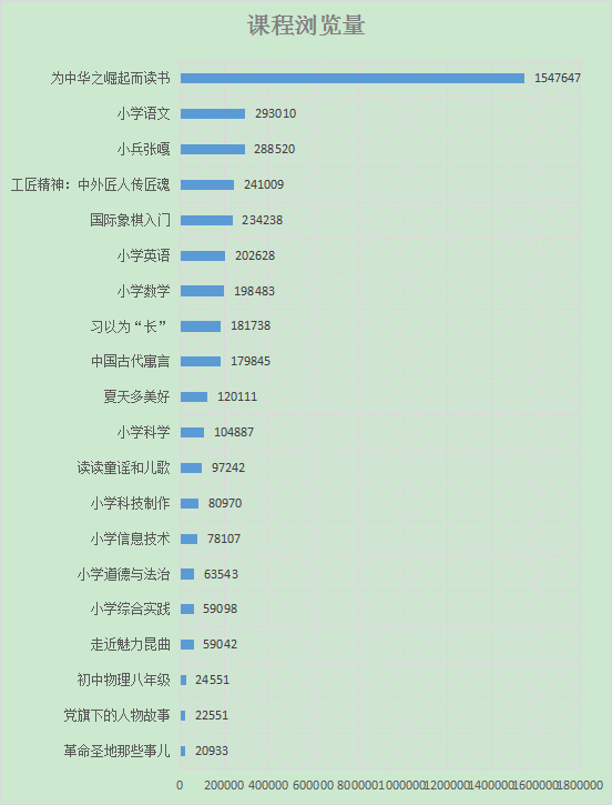 上图为活动课程浏览量最多的20门课程,其中《为中华之崛起而读书》课程浏览量达到了1547647次。