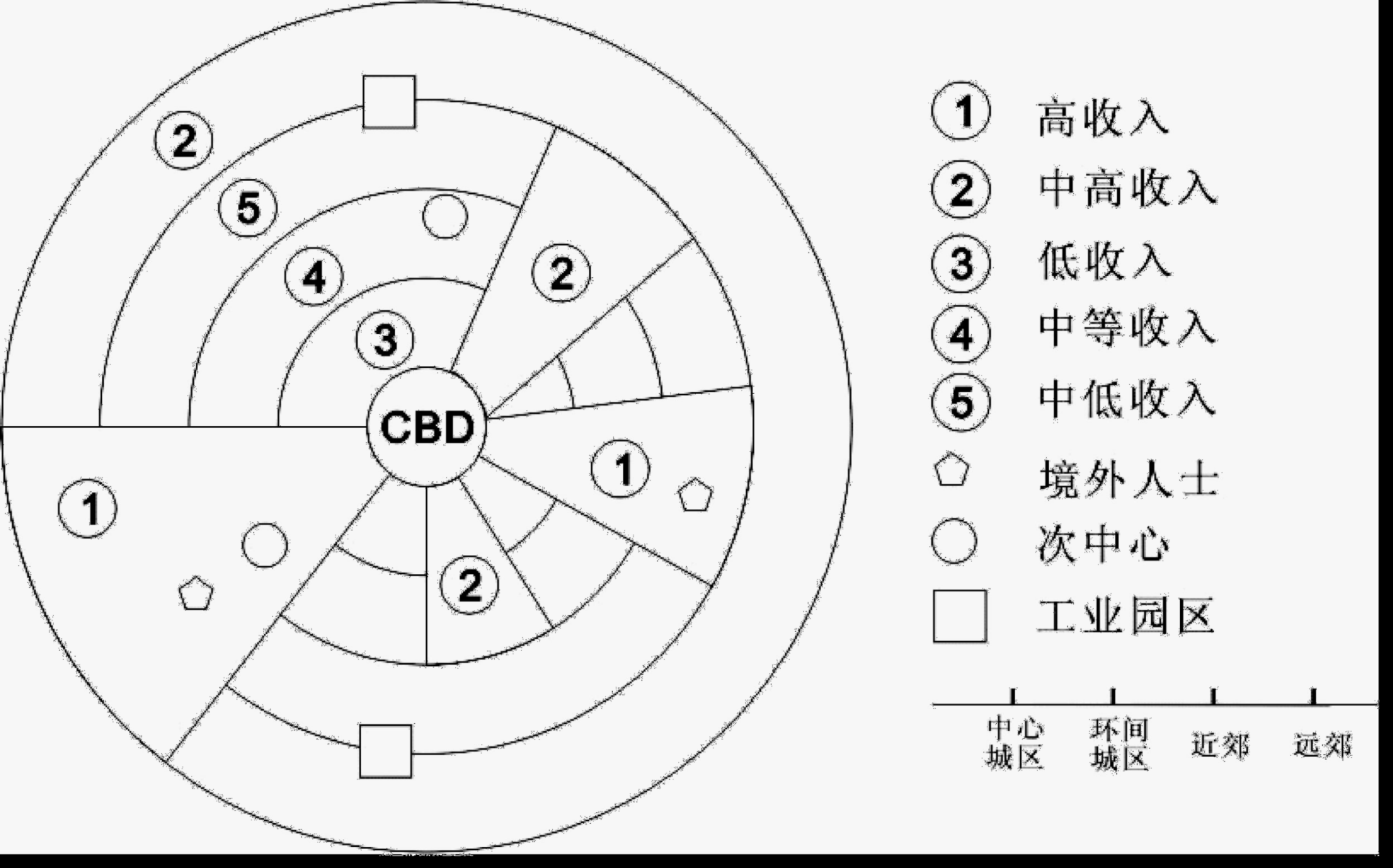 上海的城市社会空间结构模型主要由四大圈层、四大扇区和两个次中心组成(参见图2) ,即主要由同心圆、扇形、次中心三个模式叠加而成。四个圈层主要是: (1) 围绕中央商业区(CBD) 的内城区。这里主要居住着中高收入阶层,此外,还有部分低收入、贫困的本地居民和外来流动人口,他们的住房主要是中心城区未改造过的旧式里弄、简屋。(2) 中环线附近的环间城区。这里主要分布着中等收入的普通工薪阶层。他们的住房主要是老公房和新建中档商品房。(3) 近郊区。由于地处城乡结合部,交通便利,这里是外来流动人口的主要聚居带。此外,还有政府重大工程动拆迁商品安置房也分布在近郊区。因此,这里也成为城市中低收入人群的聚集区。(4) 远郊区。这里是上海独立型、经济型等高、中档别墅的分布区。随着私家车的增加,部分中高收入阶层将从中心城区外迁,生活在生态环境优良的远郊区。