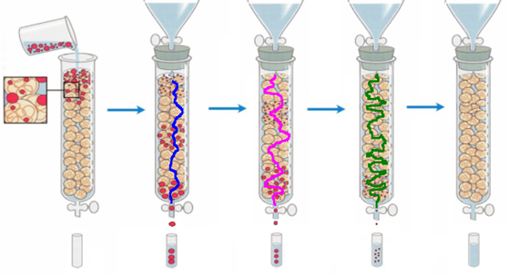 凝胶渗透色谱对分子链分级的原理就是体积排除理论:让被测量的高聚物溶液通过一根内装不同孔径凝胶的色谱柱,柱中可供分子通行的路径有粒子间的间隙(较大)和粒子内的通孔(较小)。当聚合物溶液流经色谱柱时,较大的分子被排除在粒子的小孔之外,只能从粒子间的间隙或者尺寸大的孔道通过,其路径短,故速率较快;而较小的分子可以进入粒子中的小孔,因小孔径的路径长,分子通过的速率要慢的多。经过一定长度的色谱柱后,分子根据相对分子质量被分开,相对分子质量大的在前面(即淋洗时间短),相对分子质量小的在后面(即淋洗时间长),如下图所示。