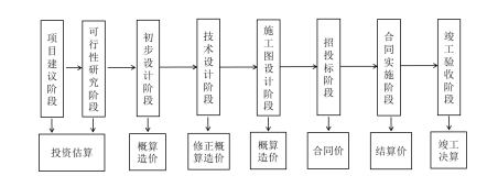编制阶段 | 项目设计书可行性研究 | 初步设计、 扩大初步设计 | 施工图设计 | 招标投标 | 施工 | 竣工验收 |