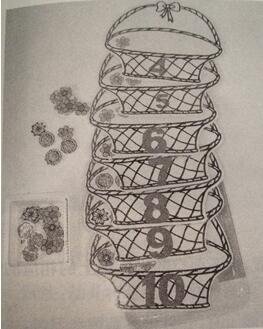 材料:7个自制塑料平面花篮,花篮上贴有1个数字,分别为4~10。每个花篮上面已经印固定数量的某种花,但量少于花篮上贴的数表示的量。一个盒子、里面装有各种各样的花朵若干(见下图)。