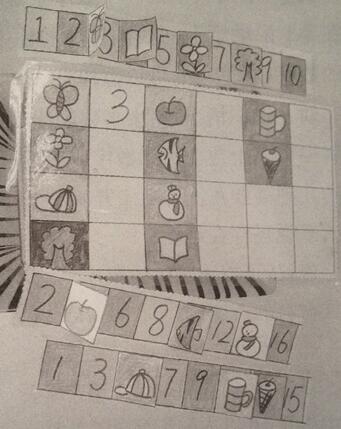 材料:三个数序纸条,第一个为1~10的所有数,第二个为1~16中所有偶数,第三个为1~15的所有奇数。三个数序条上分别有个别的数字被不同的物体图片遮挡。一张塑封A4记录纸,上面有与数序条上用于遮挡物体图片相同的图,图旁边有一个空白格(见下图)。