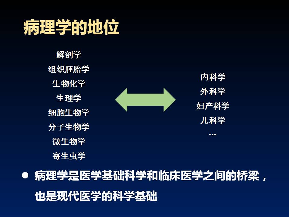 在病原刺激和机体反应相互作用下,人体组织形态、代谢功能会发生各种改变,是认识和研究疾病的重要依据。病理学(patho1ogy)的任务就是运用各种方法研究疾病的原因(病因学)、发生发展过程(发病学)以及在此过程中功能、代谢和形态结构的改变(病变),阐明其本质,从而为认识和掌握疾病发生发展的规律,为防治疾病,提供必要的理论基础。生活机体的细胞和组织经常不断地接受内外环境各种刺激因子的影响,并通过自身的反应和调节机制对刺激作出应答反应。这种反应能力可保证细胞和组织的正常功能,维护细胞、器官乃至整个机体的生存。但细胞和组织并非能适应所有刺激的影响,当刺激的性质、强度和持续时间超越了一定的界限时,细胞乃受损甚至死亡。