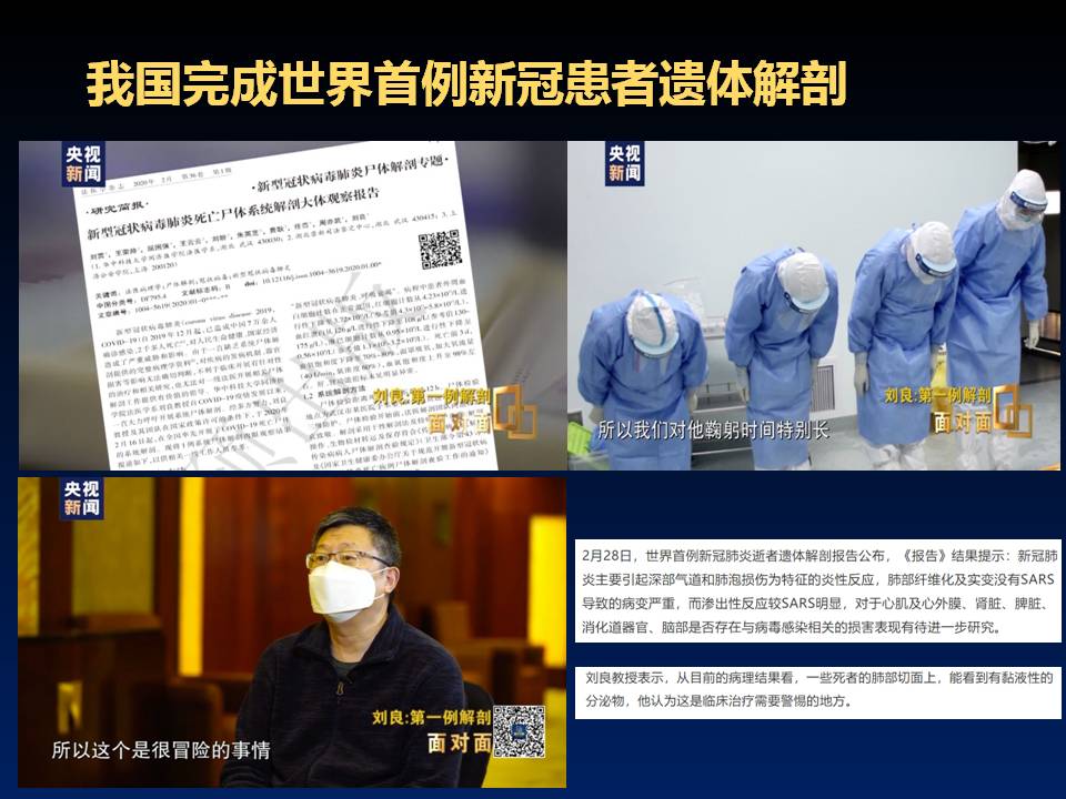 病理医生被誉为“医生的医生”。尸体解剖是病理学的基本研究方法之一,相比于死后活检,可以从宏观(人体)到微观(细胞),全面系统地观察人体器官的变化。钟南山院士指出:第一,我们可以探讨它的传播途径。第二,要针对这个地方,研究用药。还有就是弄明白这个病毒是通过什么机制让肺受到损伤的。如果找准的话,就可以针对性地采取保护性措施。没有尸体解剖的话,基本上就搞不清楚对手,也搞不清楚它打击你的方向,整个是茫然的。2020年2月16日,全国首例新冠肺炎逝世患者的尸体解剖工作由华中科技大学同济医学院法医病理教授刘良团队完成。研究发现,病变造成气道大量黏液,主要引起远端肺泡损伤。随后,武汉协和医院等多家医院建立清肺小组,用纤支镜为重症患者清理肺部黏液,对患者症状改善明显。在解剖过程中,无法预计有多少病毒散发出来,时间越久浓度越大,作为一群刀尖上的舞者,他们知险而进,向最核心、最危险的地方。“这是我的工作,也是我的责任,必须冲上去!” 刘良教授团队成员如是说,显示出在疫情面前作为医务工作者崇高的责任心与奉献精神,值得我们所有医学生学习。