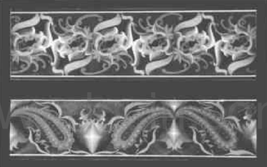 ④边缘式。即图案沿特定的外形边缘,也称花边纹样,有对称式、自由式和连续式。边适合纹样一般用做衬托中心纹样, 也可单独使用,一般用于器皿周边的装饰。