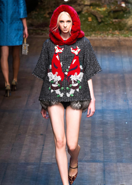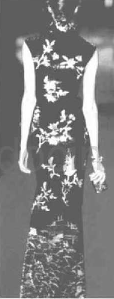 与上面所讲的局部装饰相对,整体的装饰即所谓的“面”的装饰,也就是面料的选用。我们常用的面料是四方连续图案和独幅图案。独幅图案的运用使服装更具特色,它是以风景、人物、动物、花卉等具象或抽象图案作为纹样,与服装款式巧妙地结合,形成的图案装饰。例如,裙子上的纹样从底摆处向上用花朵由密到疏逐渐过渡,人体纹样与真人的巧妙结合,使服装具有了变化和精巧的装饰感。有些服装是先裁片后印制,由于工序的影响,在数量上相对减少而在成本上要相对提高。
