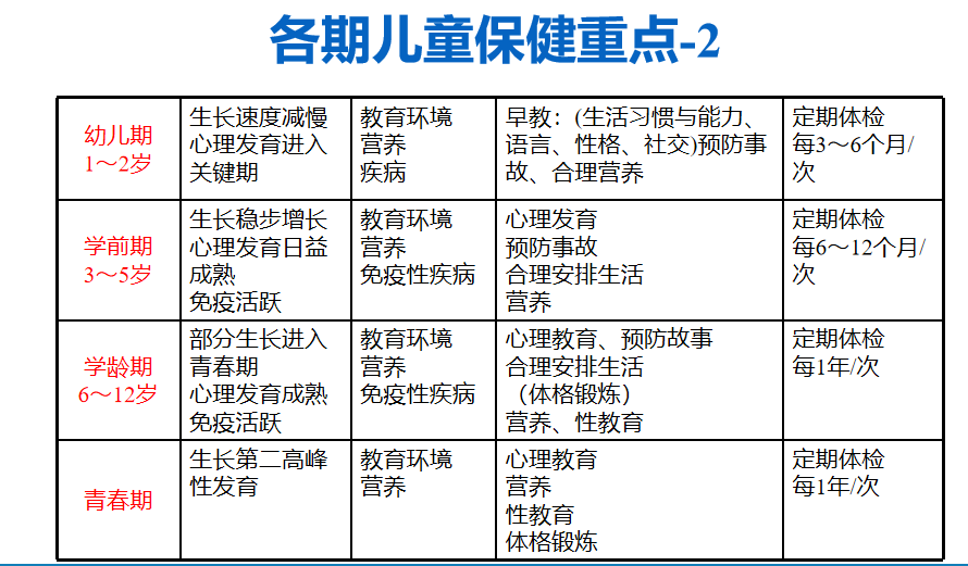 定期体检,预防疾病 每6~12个月一次体检,继续使用生长发育检测图,检测营养状况。筛查缺铁性贫 血、做好眼保健、口腔保健。定期进行免疫接种。预防溺水、外伤、误服药物以及食物中毒等意外伤害。