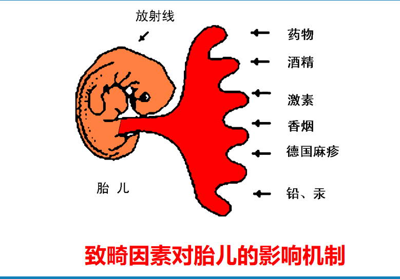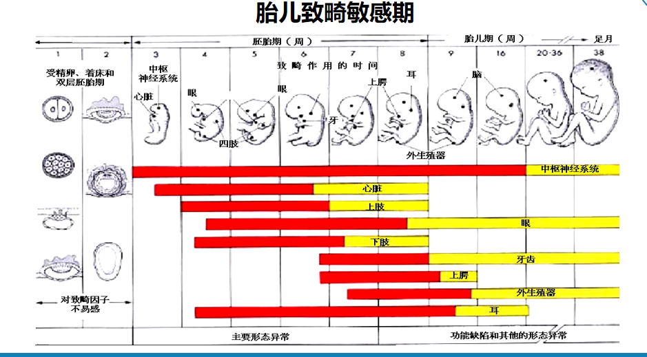 1、胎儿期特点:致畸敏感期(critical period): 胎儿早期(3~8周)