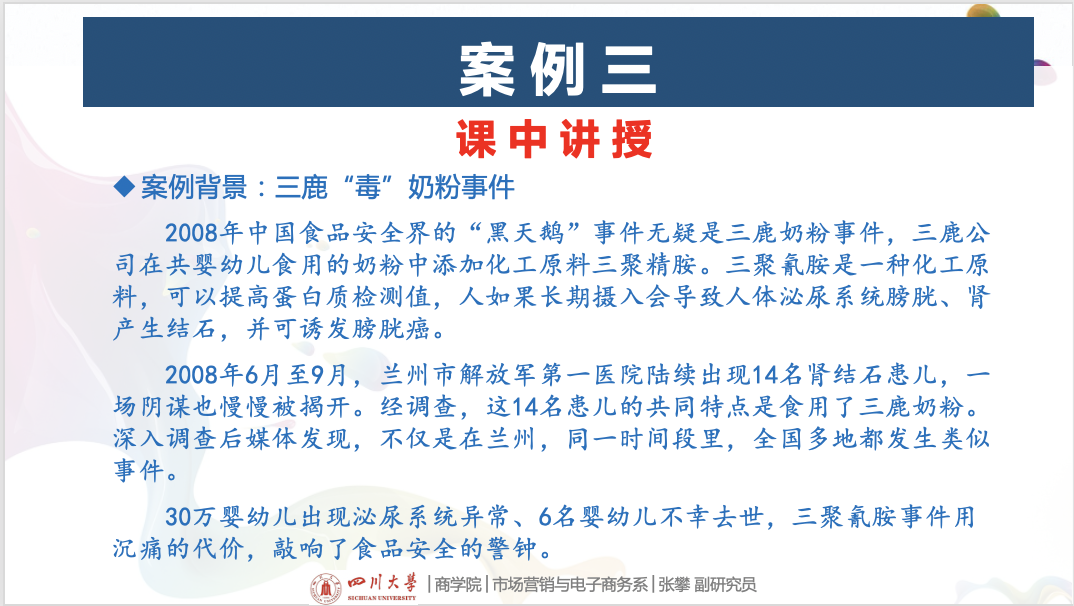 本课程将通过“三鹿毒奶粉”反面案例,引导学生建立“德技"并重的营销观念、增强法治精神,以保证人才培养方向的正确性,达到法治精神、德性素养与技术技能的统一。