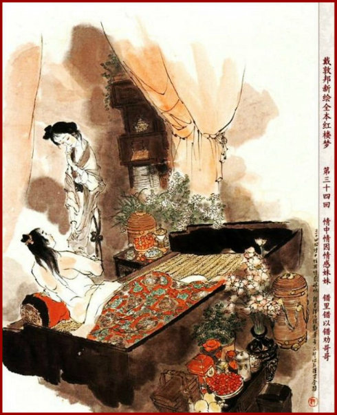 第三点,是大家也经常提起的,那就是宝玉挨打的那一回。挨打以后,林黛玉非常的伤心。第三十四回叫“情中情因情感妹妹”。