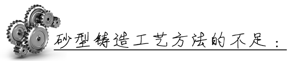 砂型是一次性使用的;生产率低;铸件尺寸精度低、表面粗糙、加工余量大,铸件组织不致密、晶粒粗大、内部缺陷较多、力学性能低;工艺过程复杂,难以实现高度自动化;劳动条件。而且,在大批量生产时,上述问题表现的更加明显。