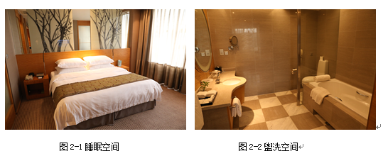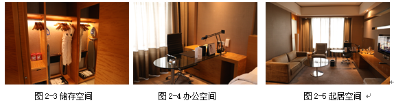 从功能上看,客房一般具备睡眠、盥洗、储存、办公、起居五大功能,因此客房相应分为五大功能区域,每个区域有满足其相应功能的客房设备。