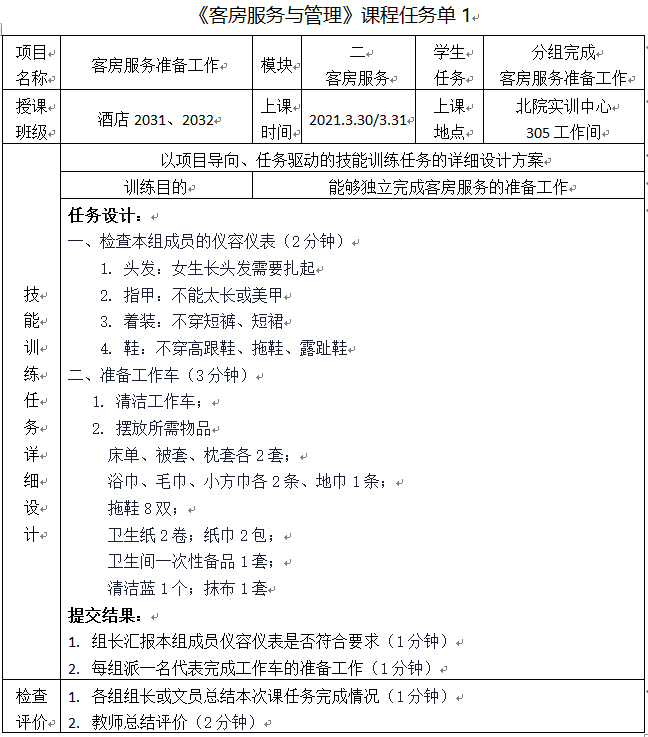 【任务导入】:安排学生进入酒店客房部进行短期实践,跟着师傅体验楼层服务工作。学生跟着师傅在工作间内布置工作车。