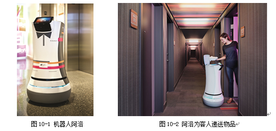 早在2014年,aloft雅乐轩酒店就推出了品牌的第一个机器人智能酒店管家阿洛“A.L.O”, (图10-1)这个智能酒店管家有着萌萌的造型,其设计灵感来自传统的管家服饰元素——白衬衫、黑领结,这个智能机器人管家会根据酒店客人的请求,把客人所要求的相关物品和服务送至客人房间(图10-2)。