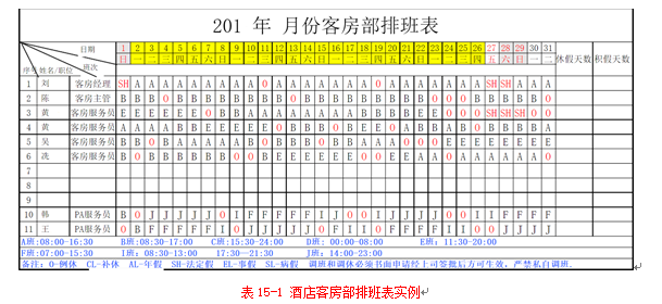 表15-1是某酒店客房部的月排班表的实例,从下表可以看出,酒店客房部员工分为八个班次(A、B、C、D、E、F、J、I)实行倒班制,每个班次各尽其责,分工合作,24小时为客人服务。酒店可以根据房间数量、客房部工作量及客房部员工数量等因素合理安排班次,保证酒店客房部工作的正常运转。