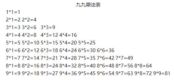 1.设计网页版的九九乘法表,具体界面如图所示。要求上传代码文件和界面截图。