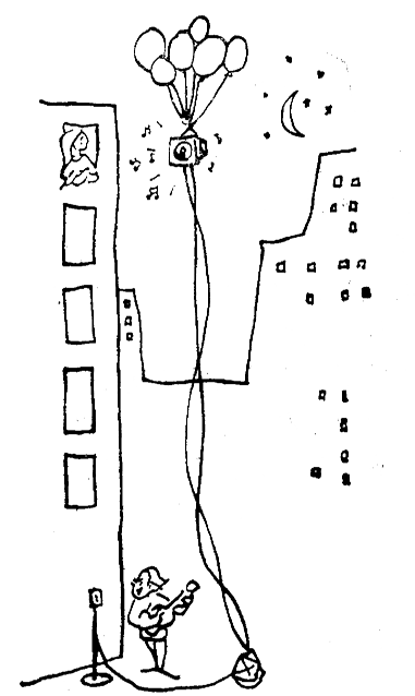 (左图)假如气球爆了,乐声就传不到那里,因为,这样一来这些东西都会离开那层楼很远。要是窗户关着,也会阻挡声音传播,因为大多数建筑物都隔音很好。既然整个过程都有赖于稳定的电流,电线一断也能产生问题。当然,这个人还可以喊,但人的声音再高,也传不了那么远。很明显,最好的情况是距离短些。这样,可能发生的问题就会少些。如果面对面,出毛病的可能就最小。
