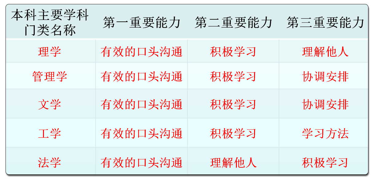 麦可思(MyCOS)公司的最新研究结果:本科人才应该具备的核心知识、工作能力和价值观(素质)核心知识:指大学毕业生在校期间所掌握的28项知识。工作能力:从事某项职业工作必须具备的能力,分为职业工作能力和基本工作能力。基本工作能力是所有工作都必须具备的能力,基本工作能力分为35项。职业工作能力是从事某一职业特殊需要的能力,根据麦可思的工作能力分类,中国大学生可以从事的职业对应的职业能力近万条。