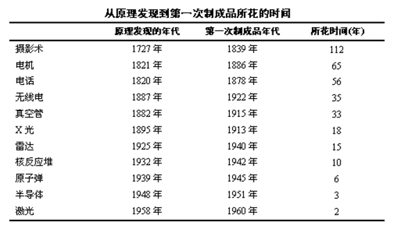 科学原理从发现到转化为技术成果的周期越来越短。