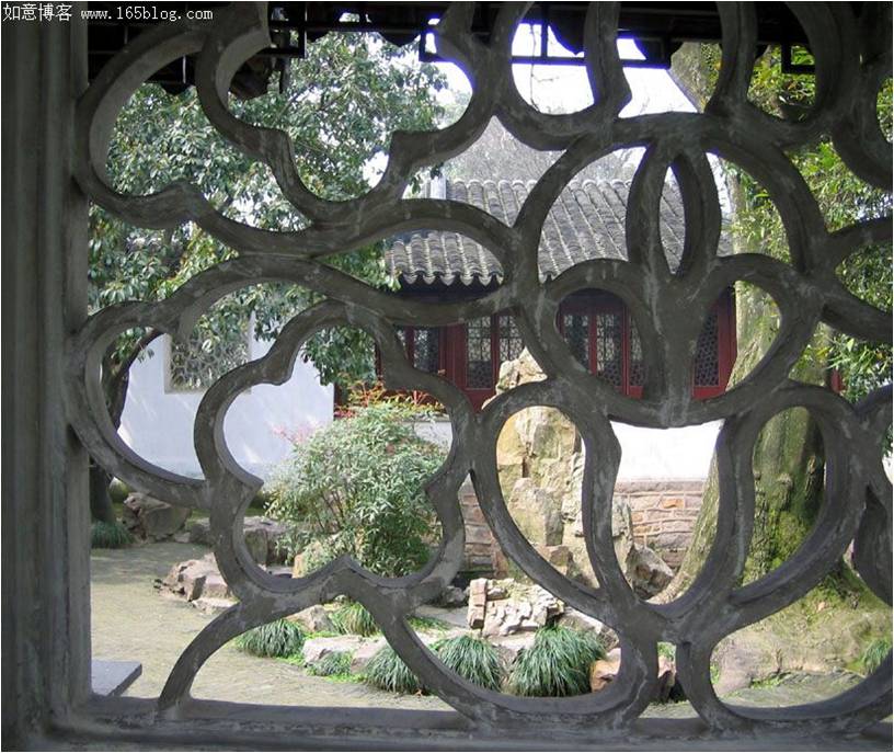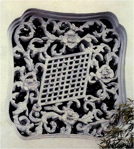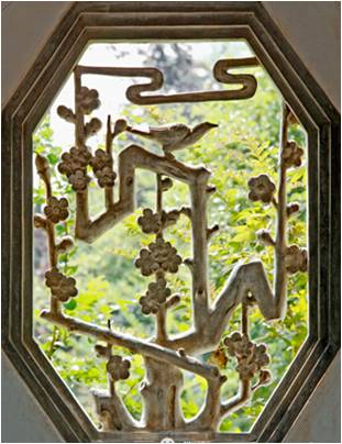 园林的围墙上,或廊(单廊或复廊)的一侧或两侧墙上,常常设以漏窗,或雕以带有民族特色的各种几何图形,或雕以民间喜闻乐见的葡萄、石榴、老梅、修竹等植物,或雕以鹿、鹤、兔等动物,透过漏窗的窗隙,可见园外或院外的美景,这叫做漏景。