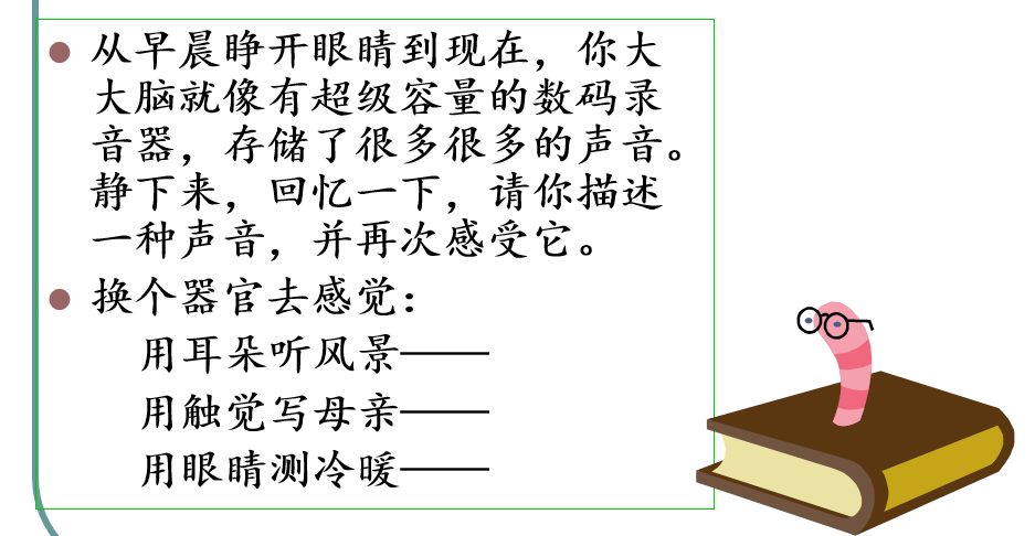 师:同学们,用几种感官同时去感受世界,大家的眼里就会出现一个五彩缤纷、多姿多彩的世界。