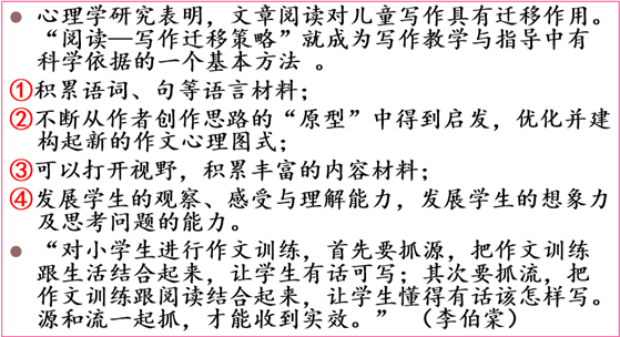 “读书破万卷,下笔如有神。”心理学研究表明,文章阅读对儿童写作具有迁移作用(可参见:朱作仁、祝新华《小学语文教学心理学》,上海教育出版社2001年版,第207~216页;刘淼《作文心理学》,高等教育出版社2001年版,第97~112页)。这样,“阅读—写作迁移策略”就成为写作教学与指导中有科学依据的一个基本方法。