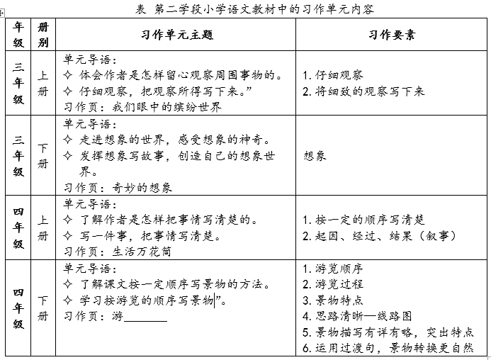 按上述分类,下表对语文教材第二学段中“习作”板块的主题内容进行了归纳和梳理。