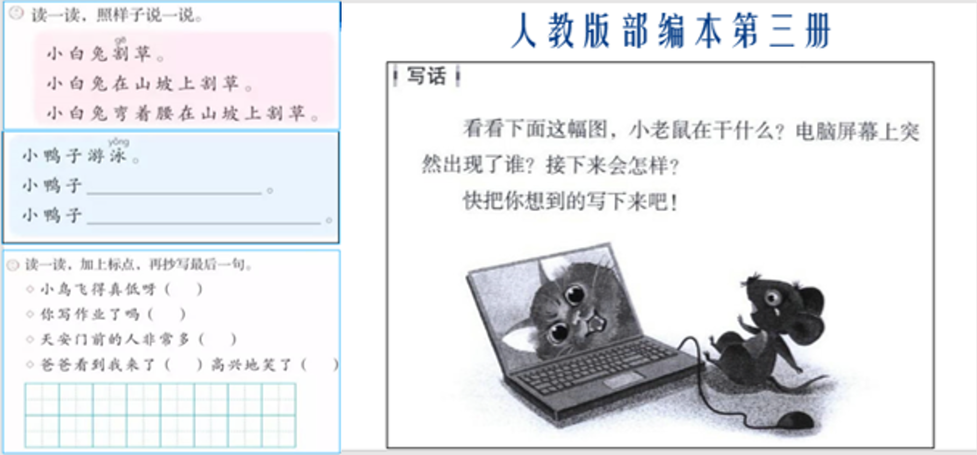 在义务教育语文课程中,“写话”出现在第一学段,即小学阶段的一、二年级。“写话”的主要目标,是让学生有能力依据语境或相关具体要求,写出一句或几句完整的话。在这个过程中,学生要注意把句意表达清楚,并且注意在写话的同时,建立好句与句之间的逻辑关系。