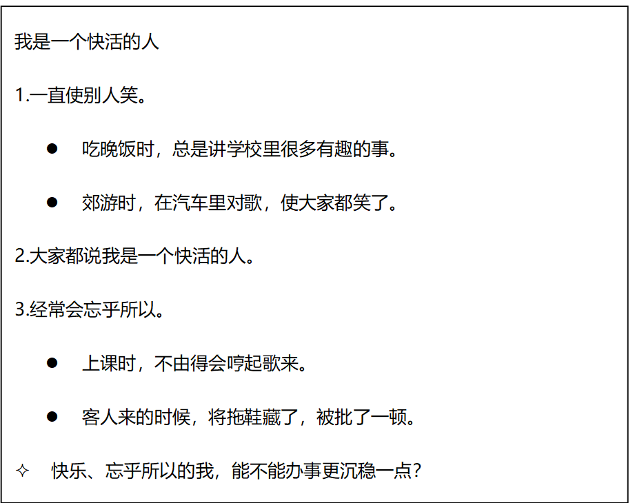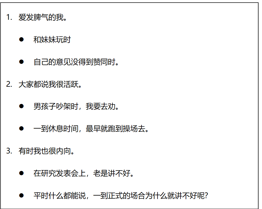 下面就自己性格的某一方面再深入思考一下,这时也可以采用上面的图来写,也可以写成下面的提纲。